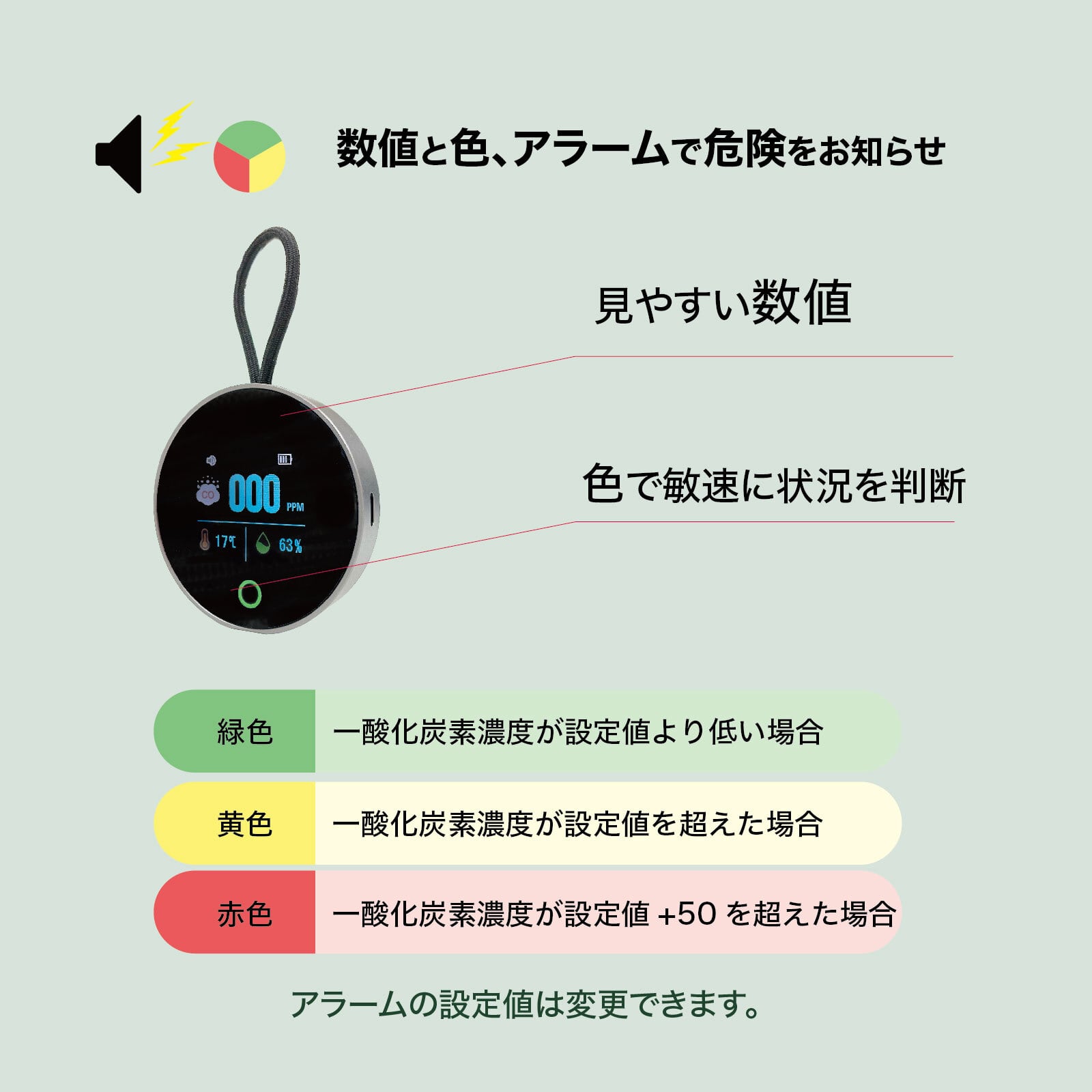 色&数値&アラームで一酸化炭素濃度をお知らせします。