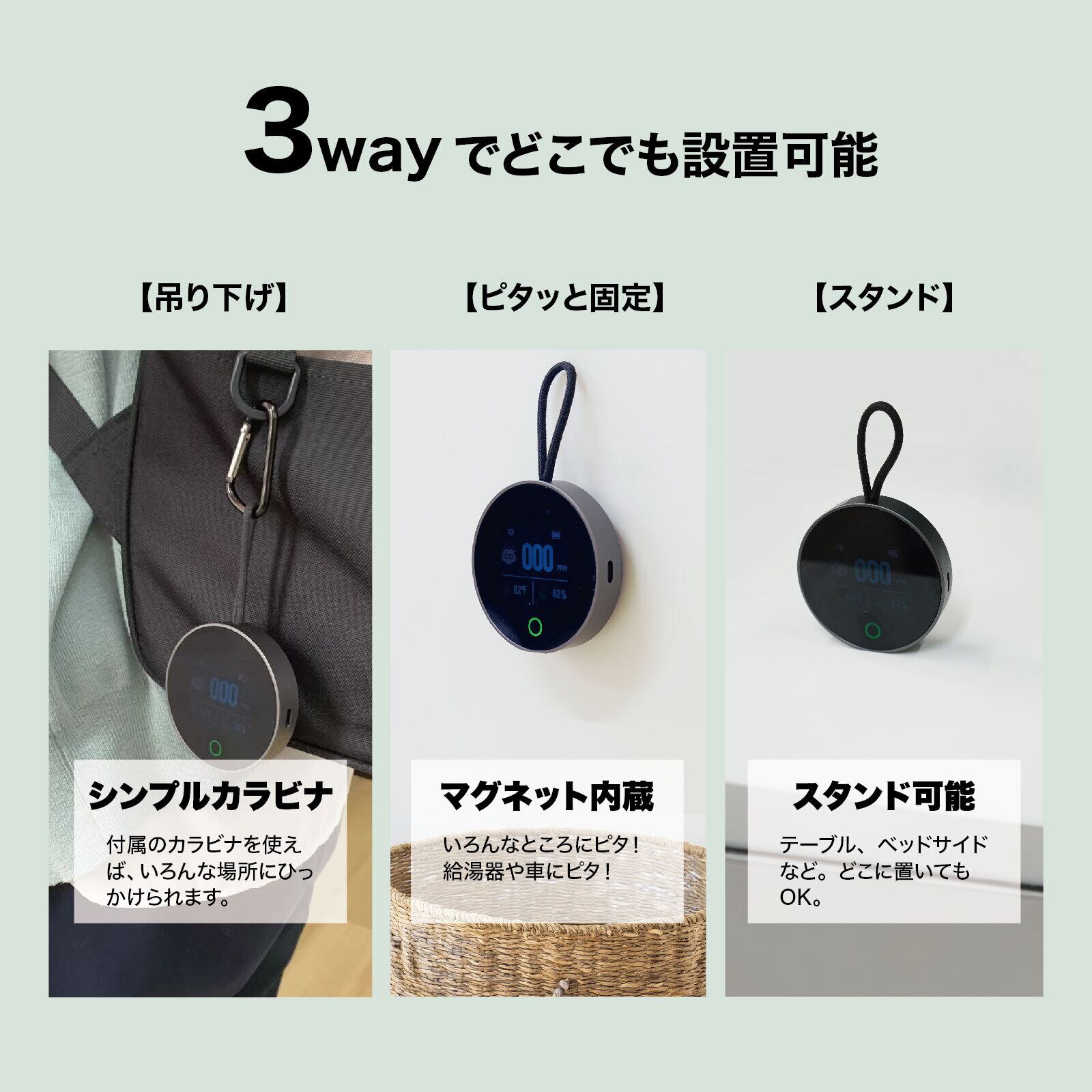 裏面がマグネットになっており、いろいろな場所にペタンとくっつきます。ストラップとカラビナが付属しているので吊り下げたり、卓上に置いたり、コンパクトで場所もとりません。