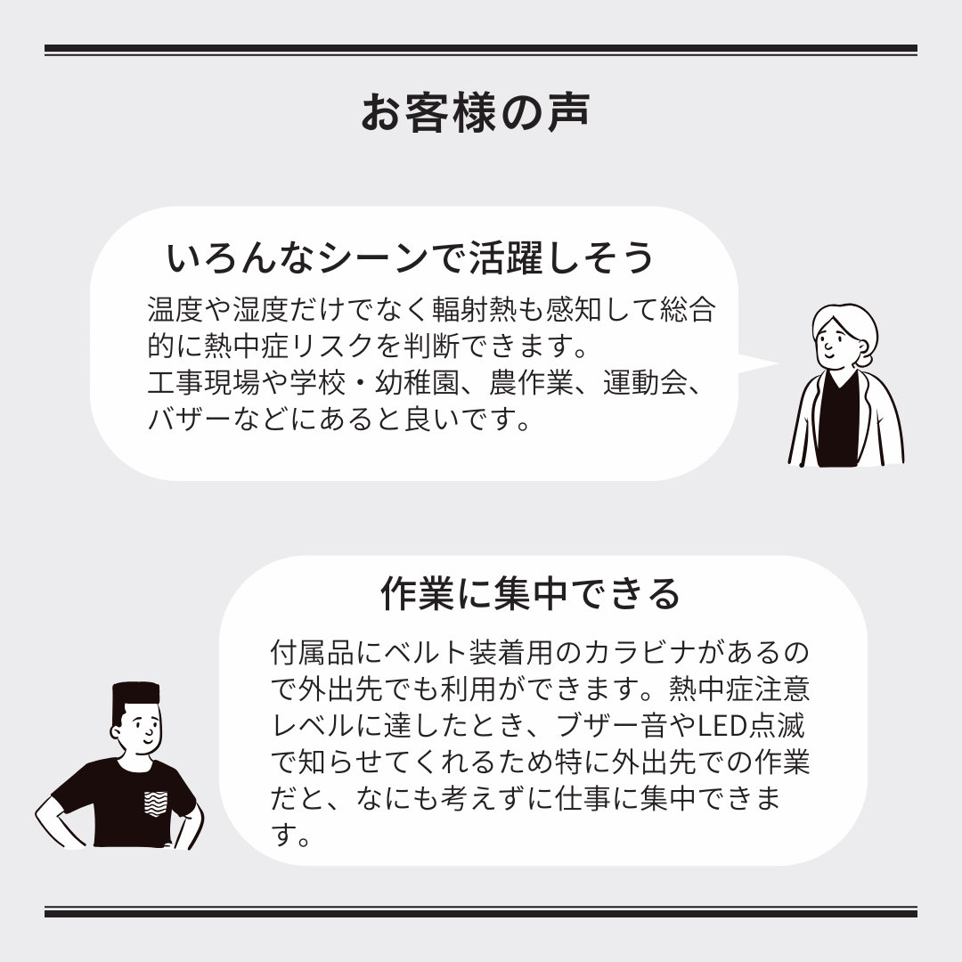 スイス製の高性能センサーを内蔵し、黒球温度、温度、湿度の3つの要素を測定し暑さ指数(WBGT)を算出します。